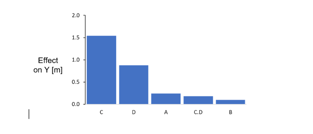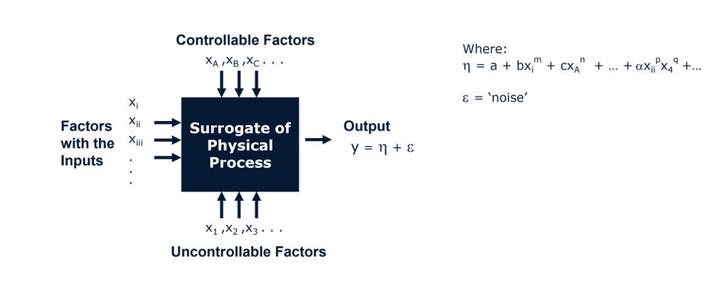 which is a specific expression of that algebraic model. Whilst it is useful for predicting and optimizing the firing range of the specific catapult arrangement being studied, within the operating range tested, it doesn’t really tell us how the system works, how we can best exploit it, and what we can do to make it better. This is particularly important if the optimized performance is still marginal with some balls still falling short of their target, or not doing any damage when they hit it. It doesn’t give us insight. For example, what is the mysterious source of variation that occurs when the positions of B, C and D are changed in the experiment?