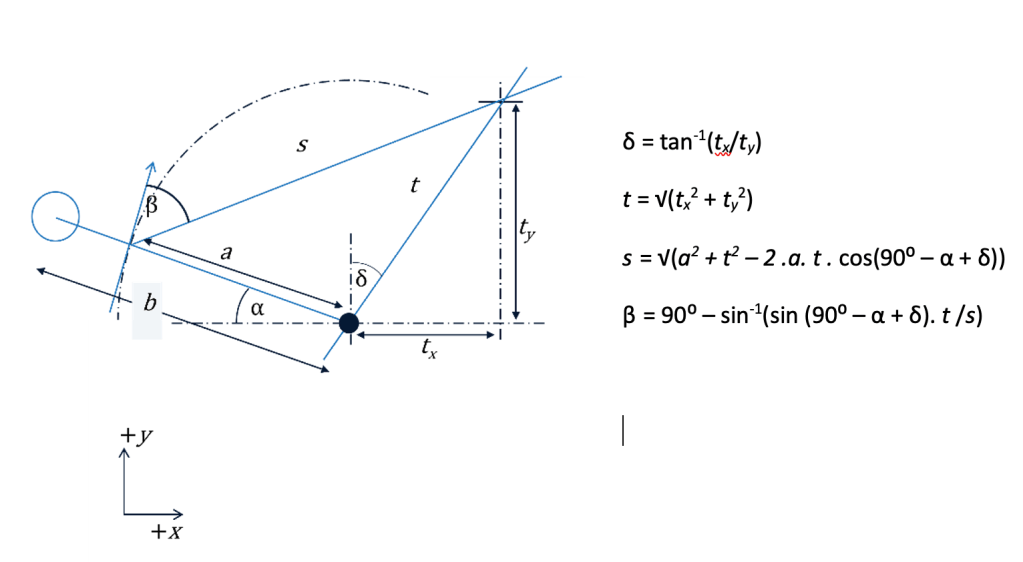 Using the cartoon we can see that we need to know the extension of the spring s and the angle β between the limits of α which are -20⁰ to 120⁰