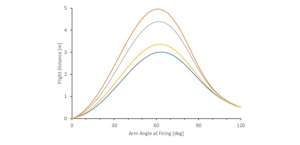 The major parasitic energy loss is greater than the energy imparted to the lighter balls, so a longer range comes at a high price. That loss is initially contained as kinetic energy in the arm, but is dissipated when the arm hits the firing pin. There is some small loss in the arm’s bearing too, but a major performance improvement comes from having an arm that is as light as possible as long as it is stiff enough..