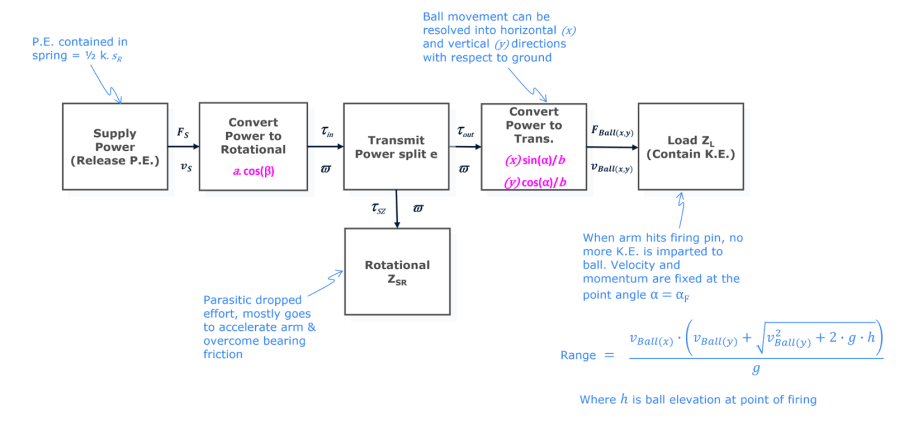 To relate the catapult to the Source-Load model we can see that there is a potential energy source which is the bungee spring that is stretched by the operator prior to release. The load is the ball, the main impedance property being its mass. The primary function is really to contain kinetic energy in the ball for subsequent release by smashing it into a target and doing as much damage as possible. This may not accord with the problem which has been defined as fire the ball the longest distance. If the objective is to destroy a target, the task would be to launch a repeatable distance with maximum kinetic energy.