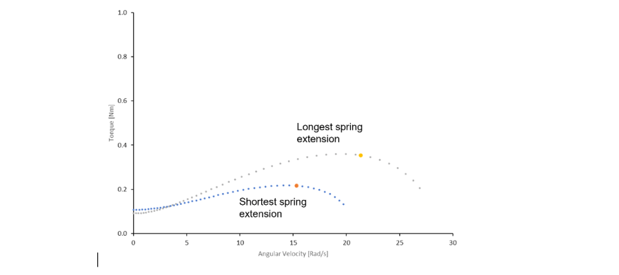 Using the geometry from the cartoon, we converted the results into rotary motion conjugates; torque and angular velocity, because that’s where the action is. We can see that the greater the mass of the ball, the more force that is required to accelerate it, or for the same force a lower acceleration is achieved meaning a lower velocity at firing, leading to a shorter range.